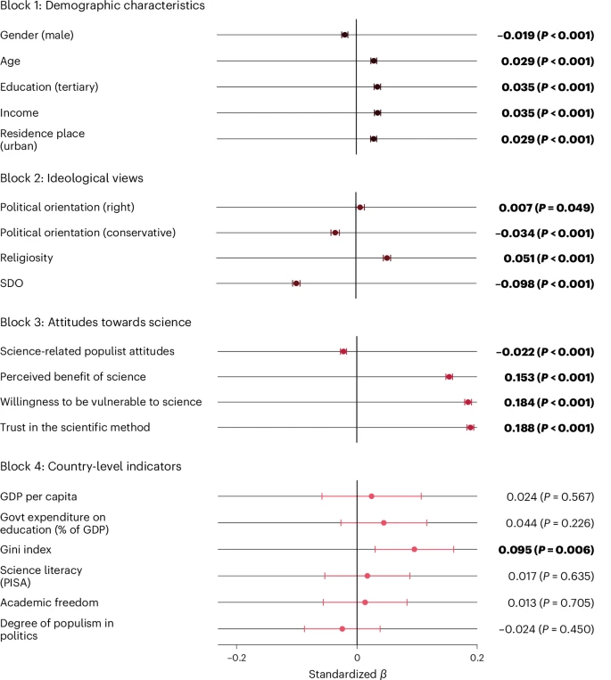 Linear random-intercept regression models of those surveyed found that higher levels of trust in science was present in the following groups: women, the elderly, people living in urban regions, people with higher incomes, religious people, educated people, and left-leaning / liberal people.