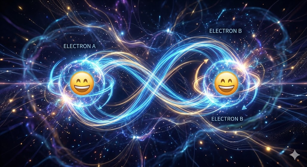 Here is the weird thing. This entanglement between electron A and electron B is independent of distance. Electron A and electron B could be on other ends of the Milky Way galaxy and still be perfectly entangled. A great explanation is here.