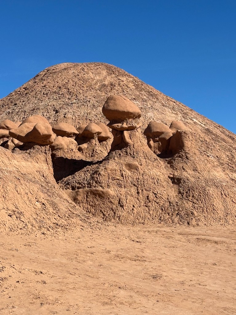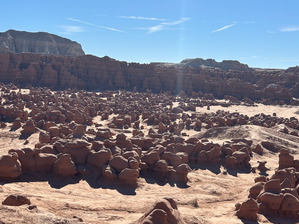The hoodoo section is a bit more famous. It consists of “hoodoos” which are geological structures consisting of soft rock like sandstone under a harder caprock. Typically, they are only a few feet tall. Millions of years of erosions make these eerie structures that appear alien-like in appearance. Hence, the name “Goblin Valley” is apropos. I guess one could look at these rock structures and assume they look like goblins. There are thousands upon thousands of these hoodoos throughout the park.