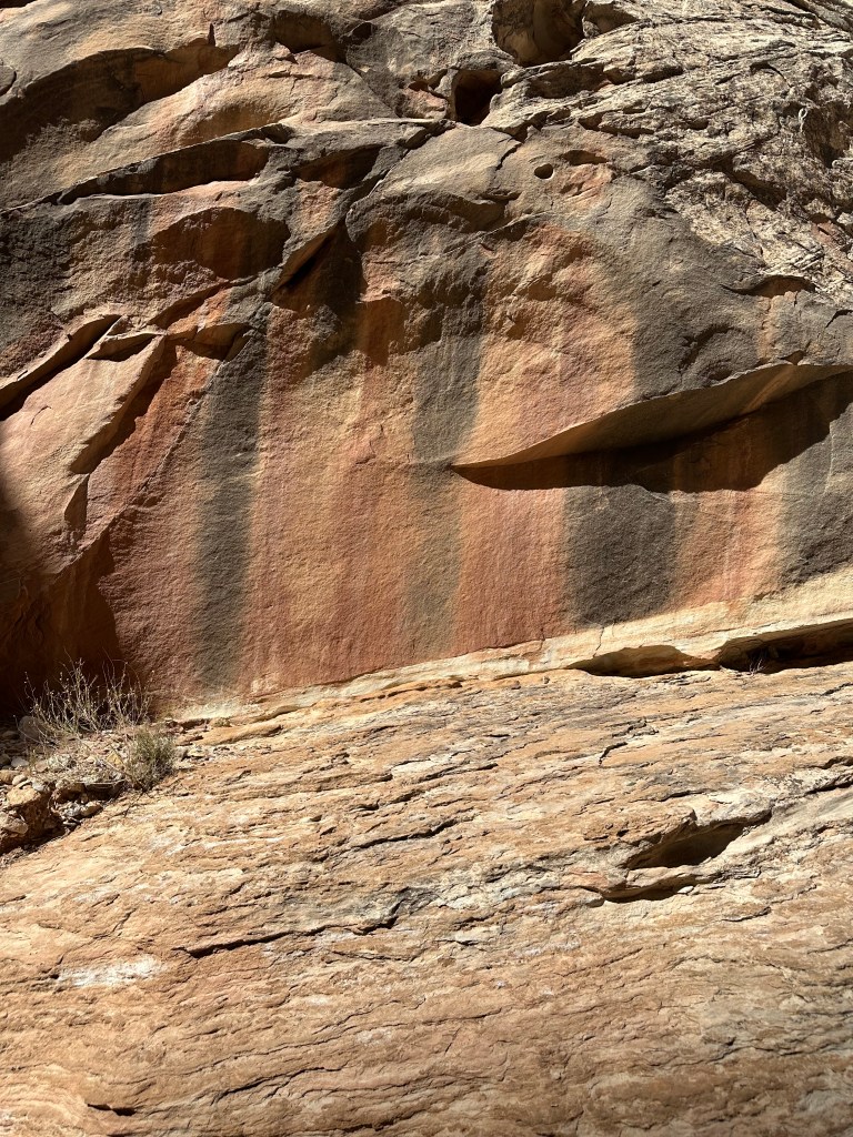 I have told people that my hike in the slot canyons felt like walking through a Georgia O’Keeffe painting. The colors were outstanding. My spouse and I found this area of alternating black and red where water had come out of the stone likely for thousands of years (below).