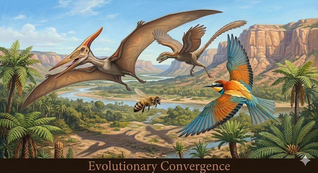 evidence of subsequent bird evolution in the Cretaceous…” We recognize Archaeopteryx as a dinosaur with wings and feathers, but did you know that birds already existed in the Cretaceous before the tragedy of the K-Pg event? Yes, Archaeopteryx (a transition fossil) and animals that we would recognize today as birds co-existed. Here is a good article explaining this discovery. The air was a niche space to be filled and was already being filled with insects and ancient flying lizards like the pterosaurs. In other words, evolutionary convergence has a long history.
